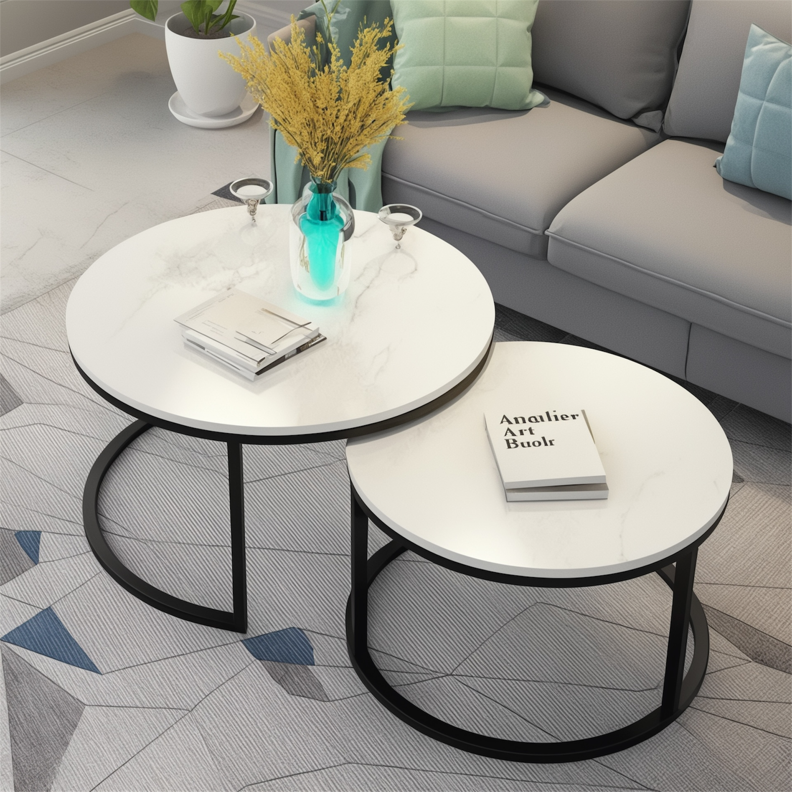 Two-piece coffee table setBlack color with a rust- and moisture-resistant electrostatic paintWhite Carrara marble top Large.